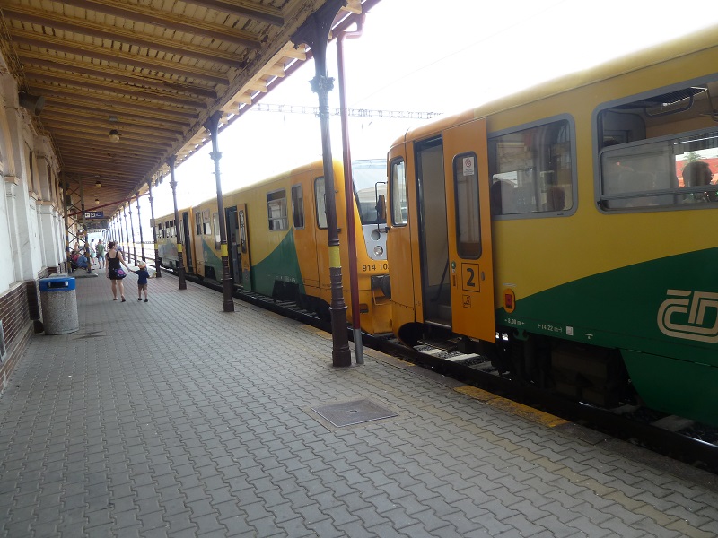 Endlich am Ziel unserer Fahrt angelangt, stiegen die Fahrgäste am Komotauer Bahnhof aus, um sich die Füße zu vertreten. Nachdem der rote und der blaue Waggon abgekoppelt und ein weiterer grün-gelber Waggon angehängt wurden, konnte unsere Rückfahrt als offizielle Sonderfahrt beginnen.